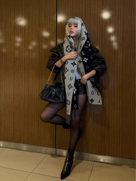 Tương tự, fashionista Quỳnh Anh Shyn chọn một thiết kế màu đen, phối đồng điệu quần shorts và túi xách kiểu dáng thập niên cũ. Cô tạo điểm nhấn cho bộ cánh tối màu bằng khăn quàng xám của Louis Vuitton.