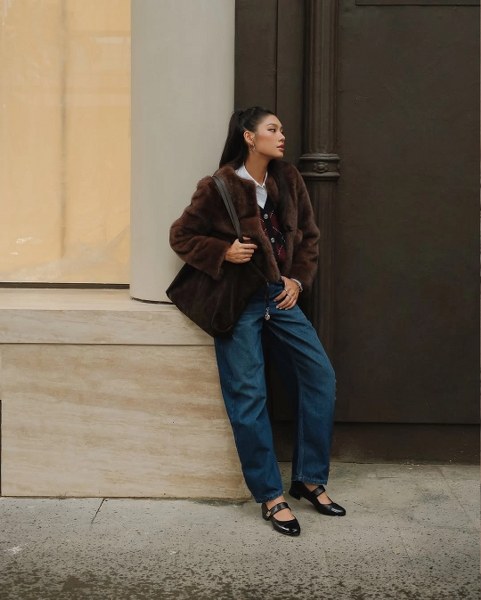 Á hậu Thảo Nhi Lê xuống phố với quần jeans, áo lông nhân tạo, kết hợp cardigan họa tiết quả trám cổ điển và giày Mary Jane.