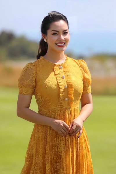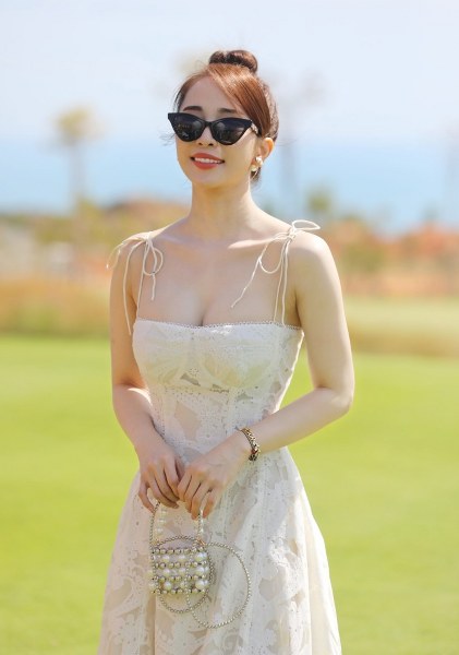 Ca sĩ Ngọc Anh diện đầm vàng nổi bật cổ vũ các golf thủ