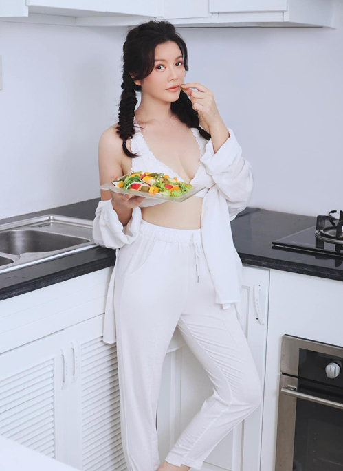 Lý Nhã Kỳ khoe vòng một quyến rũ với áo nội y, kết hợp sơ mi choàng lả lơi đứng nấu bếp. Ở nhà giãn cách, người đẹp dành nhiều thời gian cho việc nấu nướng và chụp hình.