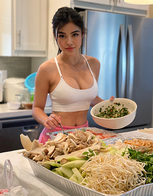 Chọn trang phục gợi cảm, Lý Nhã Kỳ, Hà Anh... tranh thủ khoe dáng khi nấu nướng.