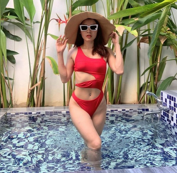 Phương Trinh Jolie khoe dáng với áo tắm mang gam đỏ nổi bật. Nữ ca sĩ chọn mẫu thiết kế cắt xẻ ngang bụng và trên eo cá tính. Cô kết hợp thêm một số phụ kiện hợp mốt mùa hè như kính mát, mũ rộng vành. Ảnh: Phương Trinh Jolie.