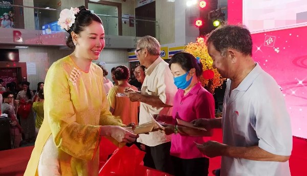Ca sĩ trò chuyện, thăm hỏi mọi người và chúc họ có một mùa Tết ấm áp, an vui.