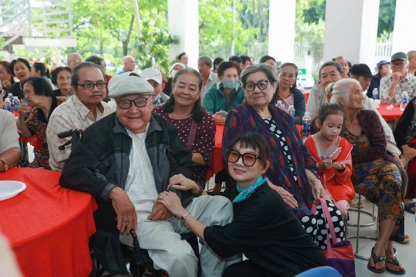 Diễn viên Lý Hùng (phải) đến chúc Tết các nghệ sĩ lão thành tại Trung tâm dưỡng lão Thị Nghè, phường Gia Định TPHCM, hôm 9/2. Lúc Khu dưỡng lão nghệ sĩ còn ở đường Âu Dương Lân, quận 8 (cũ), đây là nơi đạo diễn Lý Huỳnh chúc Tết đầu tiên. Khi Lý Huỳnh qua đời năm 2020, một trong những di nguyện của ông là các con thay cha chăm sóc các nghệ sĩ ở viện, giúp họ có cái Tết an lành.