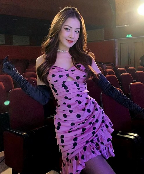 Váy vẹt chéo thiết kế bằng chất liệu vải chấm bi, xếp nếp và bèo nhún cầu kỳ mang lại phong cách retro cho Chi Pu.