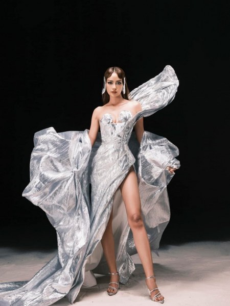 Ngọc Châu với tạo hình mới lạ trong thiết kế màu bạc đậm chất chiến binh với váy cúp ngực xẻ cao cùng đường chiết eo tôn triệt để vóc dáng. Bên cạnh phần vai dựng độc đáo và áo choàng lớn, nàng hậu khéo lựa chọn phụ kiện đeo tai để diện mạo thêm nổi bật.