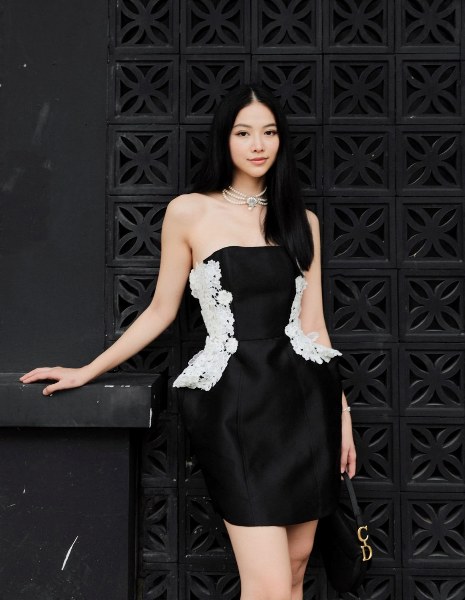 Hoa hậu Phương Khánh hoá tiểu thư với váy đen kèm hoạ tiết ren trắng đắp nổi tạo sự tương phản màu sắc. Cô phối cùng vòng cổ ngọc trai sang trọng và túi xách da hàng hiệu.