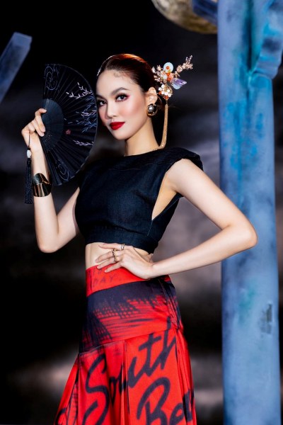 Lan Khuê sắc sảo với tạo hình mang phong cách cổ trang khi diện trang phục tone đen - đỏ gồm áo độn vai và váy in chữ sành điệu. Người đẹp chọn trâm cài đầu màu sắc và trang sức kim loại.