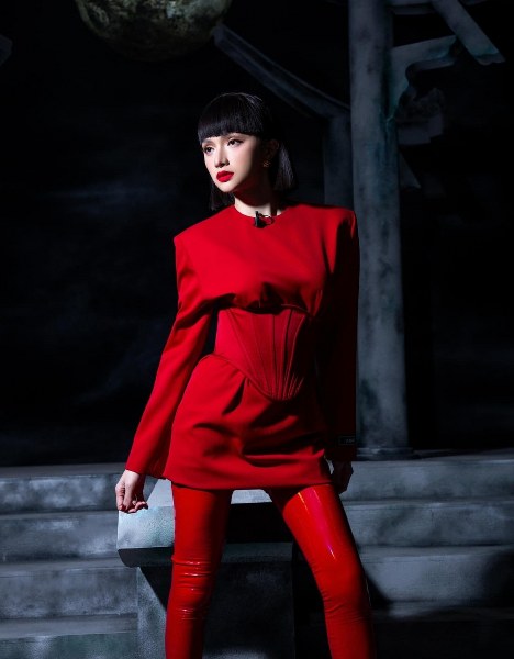 Hương Giang gây ấn tượng với cả cây đỏ gồm váy dài tay. Nàng hậu để tóc ngắn mái bằng cổ điển và chọn màu son đỏ đồng điệu với trang phục.