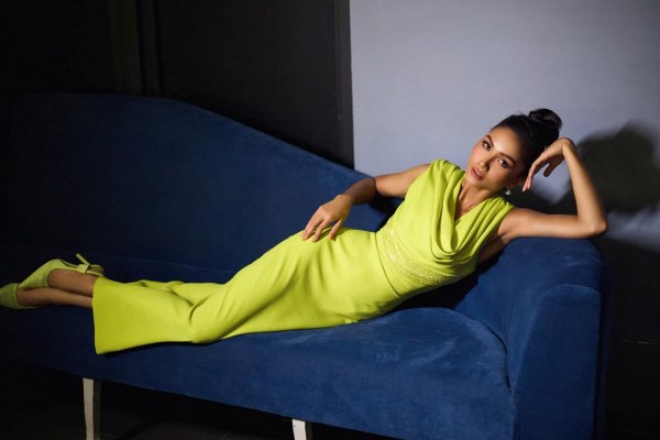 Màu xanh neon kén người mặc không làm khó H'Hen Niê khi được thiết kế với kiểu dáng dài, phần cổ đổ mềm mại và đính đá nhẹ nhàng tại eo. Cô kết hợp với giày cao gót đồng màu và để tóc búi cao thanh lịch.