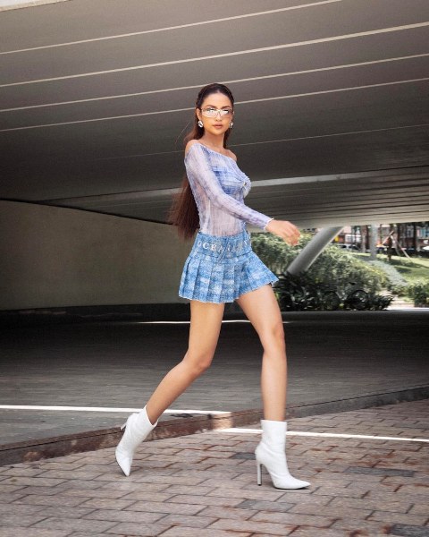 Ngọc Châu khoe đôi chân siêu mẫu với set đồ tone xanh - trắng khá bụi bặm gồm áo dài tay trễ vai và váy xếp ly giả denim. Nàng hậu phối cùng kính mát màu trong, bông tai bạc và boots cổ lửng màu trắng.
