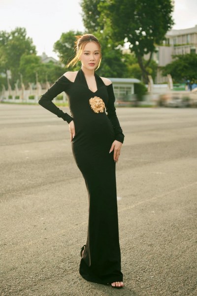 Nhã Phương khoe bụng bầu 8 tháng qua mẫu đầm đen ôm sát, dáng dài. Thiết kế có phần vai trễ vừa phải, tay dài kín đáo kèm phụ kiện kim loại nổi bật.