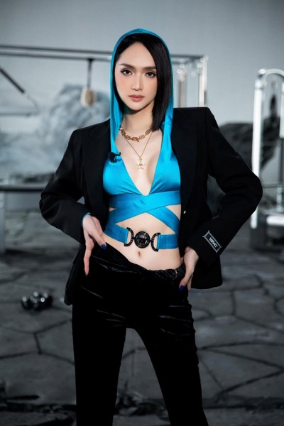 Hương Giang sành điệu khi kết hợp suit với áo mũ trùm - item đình đám của thập niên 80. Sự kết hợp giữa hai gam màu xanh - đen cùng kiểu dáng trang phục giúp diện mạo nàng hậu thêm huyền bí và cuốn hút.