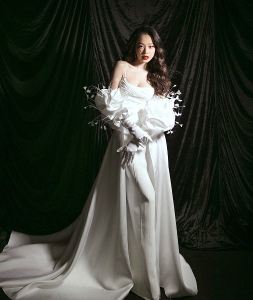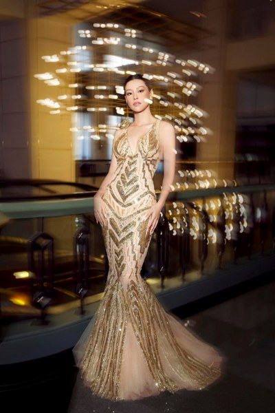 Trịnh Thuỳ Linh lựa chọn thiết kế tôn dáng triệt để với kiểu dáng ngắn trẻ trung kết hợp cùng phần tà dài rộng khoe đôi chân thon dài. Người đẹp Thanh Hoá phối cùng giày cao gót đồng màu và tiết chế phụ kiện.