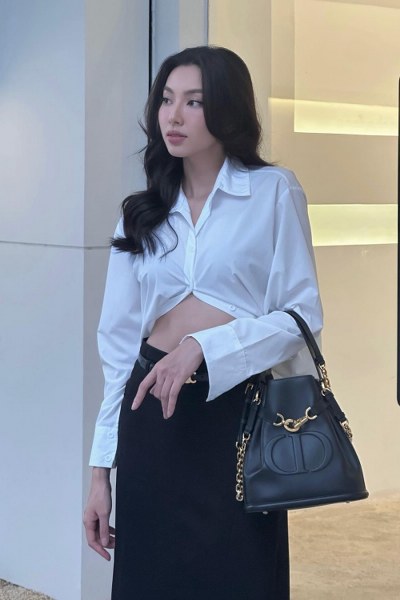 Để biến chiếc áo sơ mi trắng thời trang hơn, Hoa hậu Thuỳ Tiên khéo léo để hở nút phần dưới, kéo vạt áo ra sau khoe eo thon, tạo sự buông lơi. Người đẹp diện chân váy dạng công sở kết hợp thắt lưng bản nhỏ và túi xách để hoàn thiện trang phục.