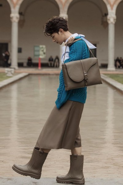 Là nghệ sĩ tham dự Tuần lễ Thời trang Milan năm nay, Anh Tú Atus tiếp tục nổi bật ở trời Âu khi mặc chân váy dạo phố. Nam ca sĩ phối cardigan chất liệu len với sơ mi cùng tông màu, đi kèm đôi ủng bản to và túi xách. Đây là lần hiếm hoi chồng diễn viên Diệu Nhi táo bạo diện outfit mang nét nữ tính, nhẹ nhàng.