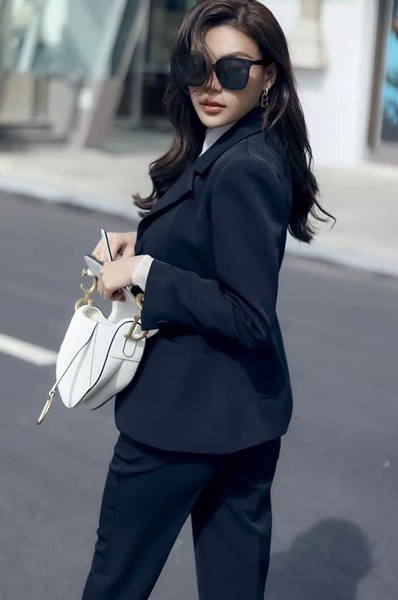 Diễn viên Thúy Diễm với hình ảnh chỉn chu cùng bộ suit kết hợp giữa áo blazer và quần âu ống đứng đồng điệu sắc màu, chất liệu.