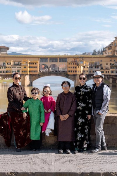 Đỗ Hải Yến (trái) cùng chồng - doanh nhân Calvin Tài Lâm (phải) và các con cùng người thân đón xuân Bính Ngọ tại Italy.