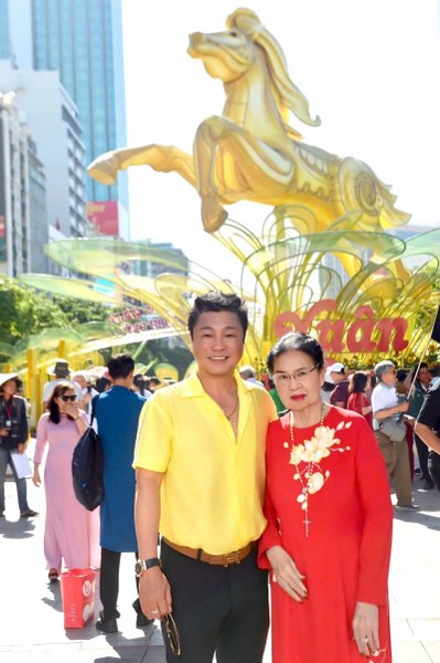Tài tử Lý Hùng đưa mẹ - bà Đoàn Thị Nguyên, gần 80 tuổi - tham quan đường hoa Nguyễn Huệ, TPHCM. Diễn viên cho biết những mùa Tết gần đây, sau khi cha - nghệ sĩ Lý Huỳnh qua đời, anh dành trọn thời gian cho mẹ, cùng bà đi du lịch các nơi.