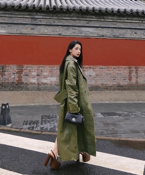 Với trech coat dài quét đất, Chi Pu phải nhờ tới đôi "cục gạch" màu nâu trong chuyến công tác nước ngoài.