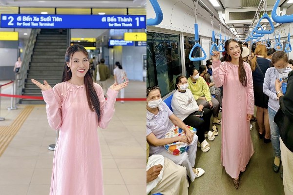 Á hậu Hoàng Oanh diện áo dài đi làm bằng tàu điện, hôm 27/12. "Sau nhiều năm chờ đợi, cuối cùng TP HCM đã có metro - một trong những biểu tượng của sự phát triển tại các nước hiện đại. Khi tàu đi qua nhiều địa danh của thành phố, nhiều người cùng ồ lên thể hiện niềm tự hào, khiến tôi dâng trào cảm xúc", người đẹp nói.