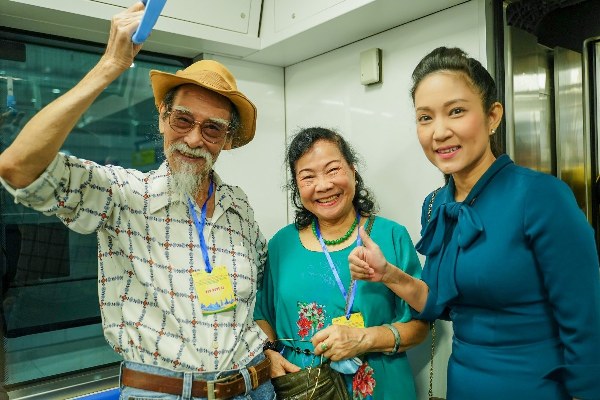 Vợ chồng nghệ sĩ Thanh Dậu, Mạnh Dung (trái) cùng Thanh Thúy - Phó giám đốc Sở Văn hóa - Thể thao TPHCM - trong chuyến thăm metro hồi tháng 2. Ông Ba bắt rắn trong phim Đất Phương Nam nói hạnh phúc vì ở tuổi 86 được chứng kiến sự phát triển của thành phố.