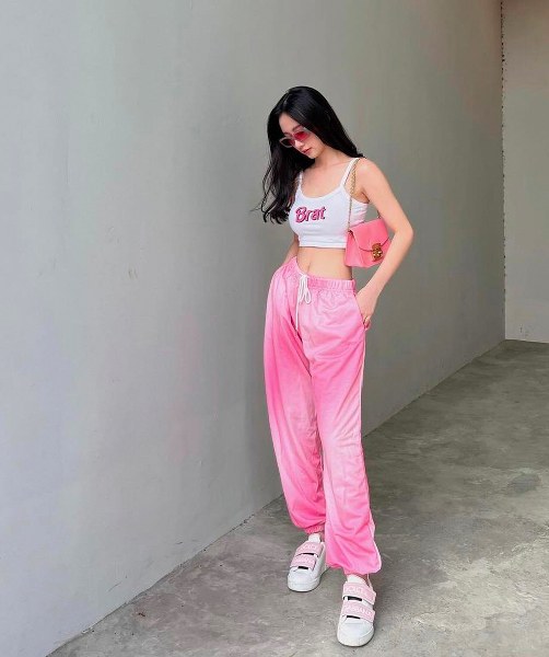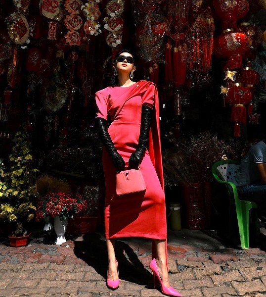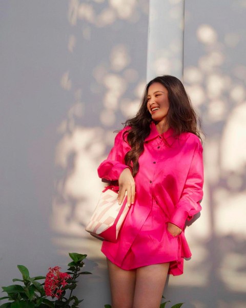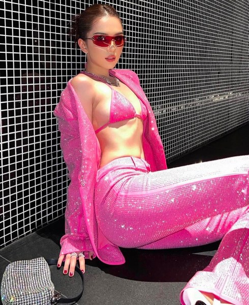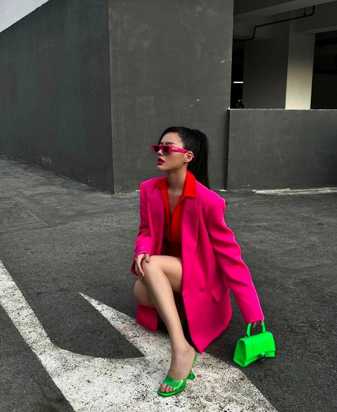 Hoa hậu Phạm Hương bắt trend dùng sắc hồng tạo điểm nhấn cho street style được nhiều sao Việt lăng-xê.