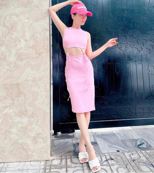 Lệ Quyên khoe triệt để eo thon với váy hồng pastel khai thác khoảng hở đi kèm chi tiết cột dây độc đáo.