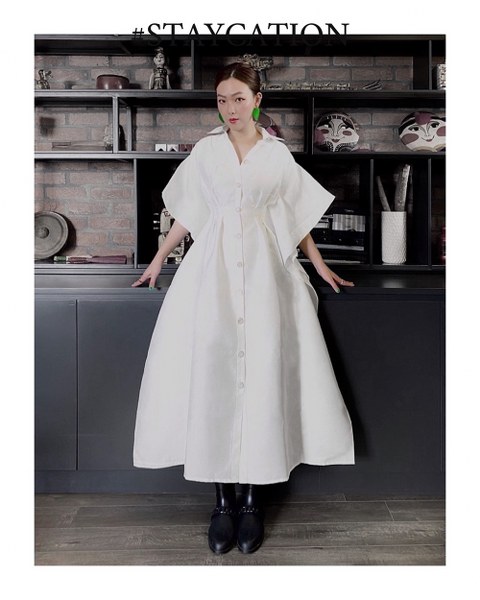 VJ Kaylee được biết đến với phong cách "tắc kè hoa" bởi lối chơi màu nổi bắt mắt cho street style. Tuy nhiên khi tham gia chiến dịch này cùng Kelbin Lei, cô nàng lại gây bất ngờ bởi cách chọn váy trắng có phom dáng cầu kỳ.