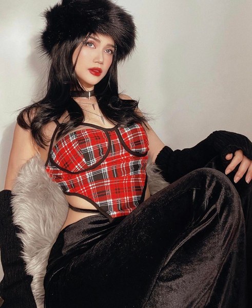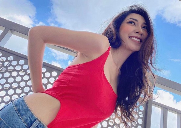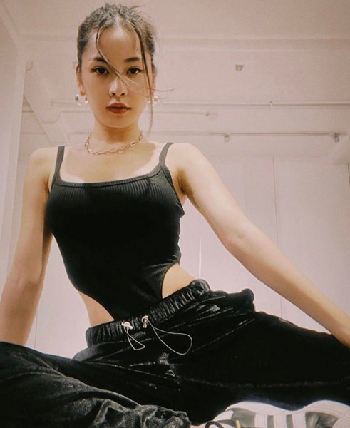 Khổng Tú Quỳnh tôn làn da sáng cùng áo thun hồng hợp trend với quần jeans lưng thấp.
