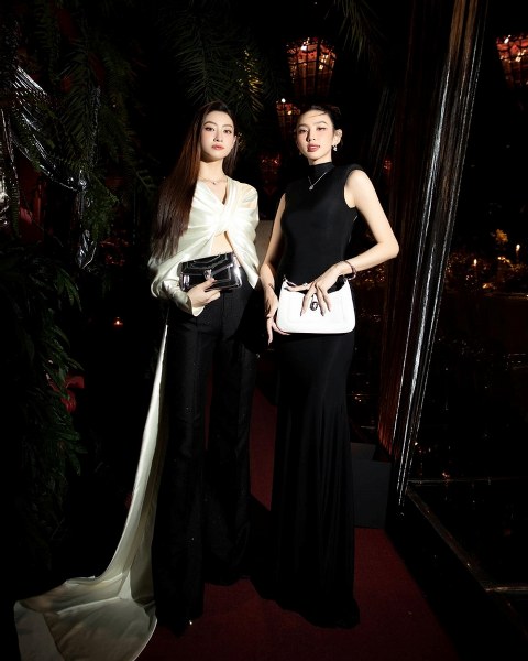 Lương Thuỳ Linh thu hút mọi ánh nhìn khi phối quần suông cạp cao và áo lụa tà dài, bên cạnh là Thuỳ Tiên khoe dáng với chiếc váy đen ôm sát. Hai nàng hậu cùng phối với túi da mang màu sắc đối lập và trang sức dáng mảnh tạo nên tổng thể vừa thời thượng và thanh lịch.