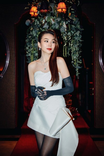 Thanh Hằng trẻ trung với váy trắng cúp ngực có điểm nhấn là phần vải gập được gắn bên hông khá lạ mắt. Nàng mẫu để tóc uốn mái cổ điển và chọn đôi găng tay mỏng màu đen để hoàn thiện outfit của mình.