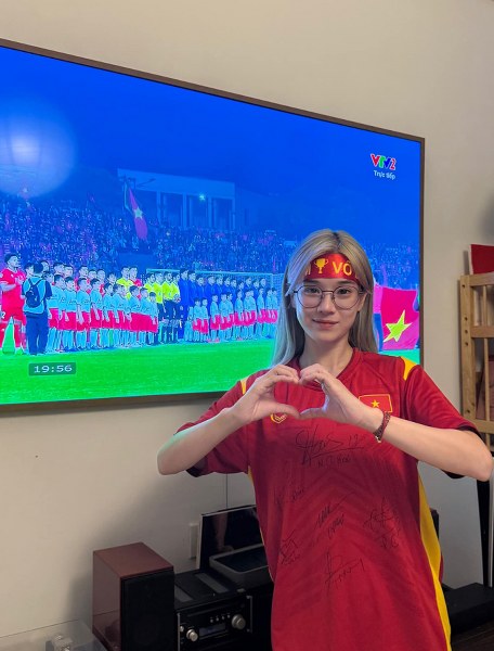 Hoàng Yến Chibi mặc áo đội tuyển có chữ ký của các cầu thủ cô yêu thích như Nguyễn Quang Hải.