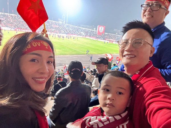 Vợ chồng ca sĩ Hoàng Bách đưa con trai út đến sân Việt Trì ủng hộ đội tuyển chiều 2/1. Ca sĩ cho biết hào hứng khi trên chuyến bay từ TPHCM ra Phú Thọ anh gặp nhiều cổ động viên đeo băng rôn, dán cờ đỏ sao vàng lên mặt, sẵn sàng cổ vũ đội tuyển nước nhà.