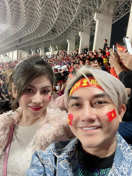 Ca sĩ Hoàng Bách, hoa hậu Tiểu Vy vui mừng khi tuyển Việt Nam thắng Thái Lan 2-1 ở lượt đi chung kết ASEAN Cup 2024, tối 2/1.