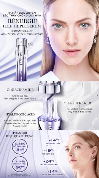 Với thiết kế Serum tươi 3 lõi, Rénergie H.C.F Triple Serum của Lancôme đã phá vỡ khuôn mẫu của khoa học bào chế, khi kết hợp các thành phần hoạt chất mạnh của từng loại để mang đến hiệu quả đồng thời và bổ sung cho nhau, mặc cho trước đây các thành phần này được cho là không thể tương thích nhau.