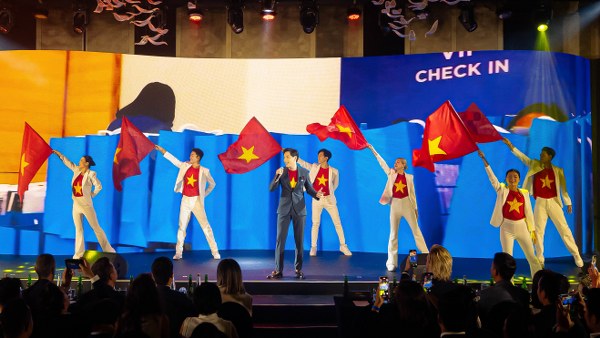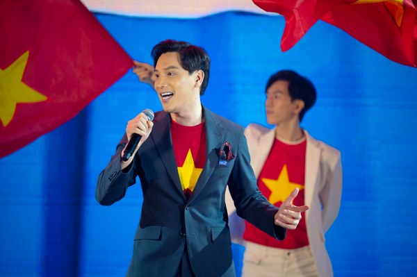 Shark Minh thể hiện ca khúc 'Việt Nam ơi' do anh sáng tác tại buổi họp báo