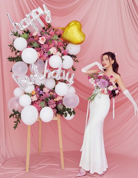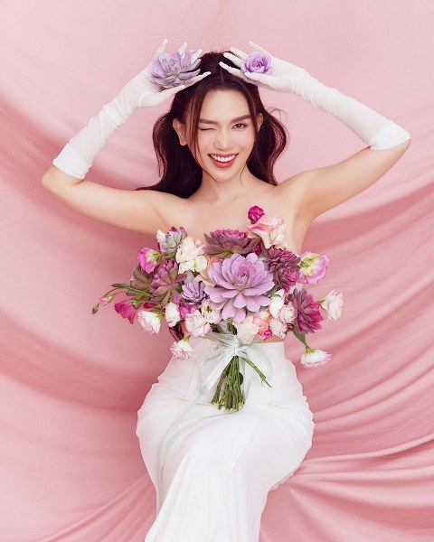 Background được trang trí với tone hồng cùng trang phục trung tính là trắng và be. Sĩ Thanh dùng sen đá làm áo tạo nên điểm độc đáo cho bộ ảnh.