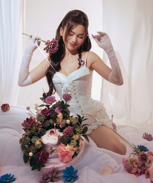 Với tone màu hồng chủ đạo, Sĩ Thanh dùng sen đá làm áo khoe trọn đường cong quyến rũ trong bộ ảnh mới.