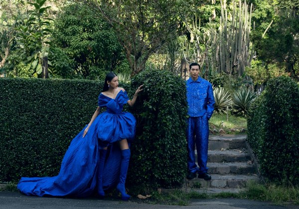 Hai nhà thiết kế trung thành với chất liệu gấm jacquard, bảng màu xanh coban rực rỡ với thiết kế công chúa nữ tính phom dáng mullet khoe trọn bờ vai gợi cảm quyến rũ. Bên cạnh đó, váy lệch vai dựng phom 3D, hay những chiếc đầm suông nữ tính giúp tôn dáng phái nữ.