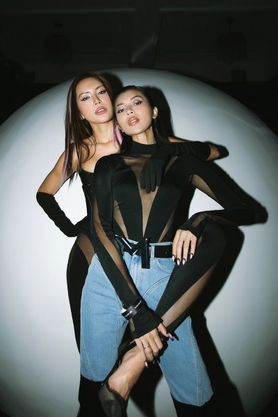 Trang phục ôm sát, co giãn với các vệt xuyên thấu được đặt để hợp lý giúp người mặc phô diễn body không chút mỡ thừa. Với mái tóc hồng và bạch kim, chân dài Việt trở nên nổi bật trong outfit màu đen.