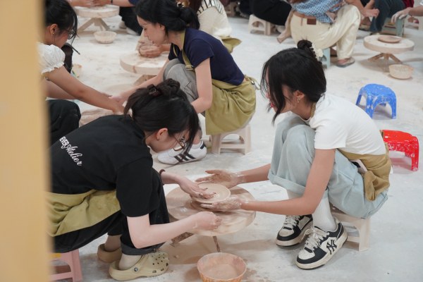 Tại đây, sinh viên được tham quan các xưởng gốm lâu đời, lắng nghe nghệ nhân kể về lịch sử hình thành và những thăng trầm mà làng nghề trải qua để gìn giữ bản sắc. Những câu chuyện mộc mạc ấy, khi kết hợp cùng âm thanh xoay đều của bàn gốm, tiếng lò nung tí tách và đôi bàn tay khéo léo của người thợ, đã tạo nên một không gian trải nghiệm đầy cuốn hút. Đặc biệt, các bạn còn trực tiếp “hóa thân” thành nghệ nhân: từ cảm giác lạ lẫm khi chạm vào đất sét mát lạnh, sự hồi hộp khi xoay bàn gốm, cho tới niềm vui thích khi nhìn sản phẩm dần thành hình. Có bạn tỉ mỉ nặn nên chiếc bát tròn đều, có bạn lại để trí tưởng tượng bay bổng với những hình thù ngộ nghĩnh.