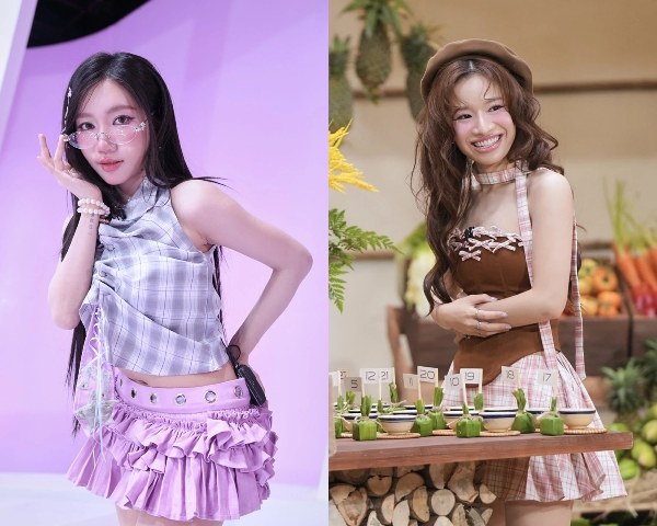 Ca sĩ Orange (trái) và Lâm Bảo Ngọc chọn thiết kế họa tiết caro.