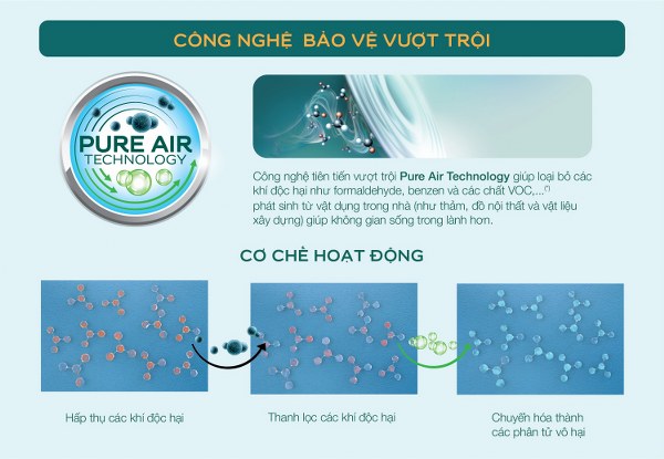 Chuyên gia từ nhãn hàng Dulux chia sẻ về cơ chế thanh lọc không khí của dòng sơn này: "Sơn nội thất sinh học Air Clean được trang bị công nghệ Pure Air Technology. Nói một cách dễ hiểu thì công nghệ này hấp thụ các khí độc hại, chuyển hóa thành các phần tử vô hại sau đó giải phóng ra không khí. Từ đó, màng sơn đóng vai trò như một máy lọc chủ động, vô hiệu hóa các khí độc hại vốn không thể xử lý triệt để bằng các phương pháp dọn dẹp thông thường".