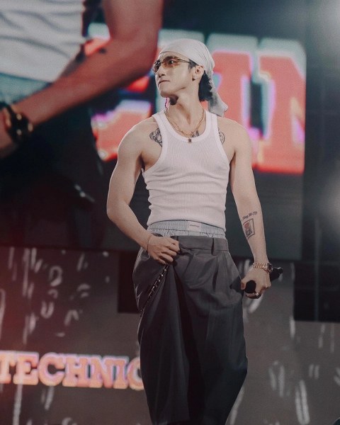 Trên sân khấu TPHCM, ca sĩ 31 tuổi kết hợp quần xám với áo ba lỗ, nội y xanh nhạt, khăn trùm đầu. Kiểu mặc quần tụt khoe nội y là một trong những nét đặc trưng của trào lưu Y2K đang quay trở lại trên thế giới, được nhiều sao nam Âu Mỹ ưa chuộng, trong đó có Justin Bieber.