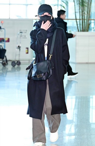 Lần xuất ngoại hồi tháng 1/2024, minh tinh ghi điểm với set đồ gồm khăn choàng, trench coat xám Fendi, boots da The Row và túi xách đen.