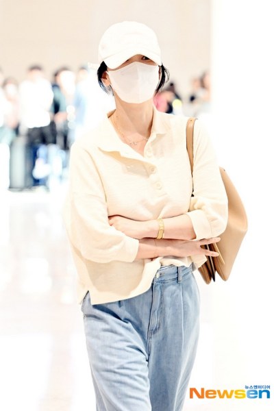 Tờ Newsen đánh giá cao phong thái của Song Hye Kyo trong chuyến công tác tháng 8/2024, "áo quần không phô trương mà vẫn toát lên nét cuốn hút, củng cố vị thế minh tinh hàng đầu Hàn Quốc". Cô phối áo Sessùn với quần denim, túi Fendi.