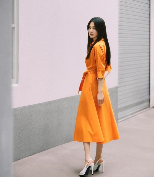 Chị đẹp Song Hye Kyo được các chuyên gia giải trí xứ Hàn đánh giá cao về gu thẩm mỹ và phong cách thời trang. Mỗi một món đồ mà cô diện đều khiến người hâm mộ không khỏi xuýt xoa, thán phục. Chiếc váy sơ mi dáng ôm xòe tự nhiên ở phần dưới với tông màu cam dường như khiến sắc thu thêm rực rỡ hơn.