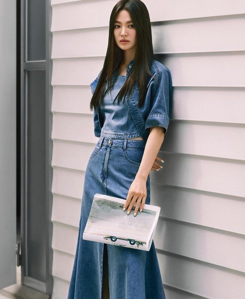 Xuất hiện trong set đồ denim gồm chân váy dài xòe nhẹ và áo tay ralgan, nữ minh tinh xứ kim chi trông thật trẻ trung, năng động như thiếu nữ hai mươi.