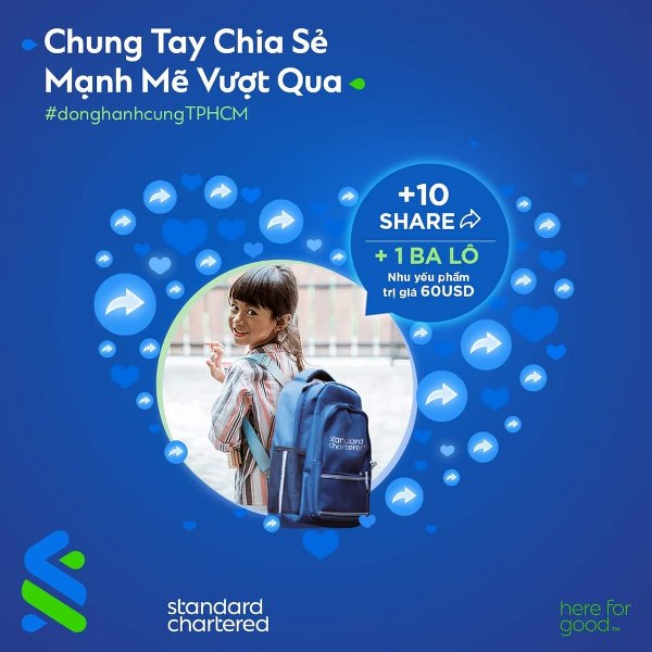 Thông qua chương trình "Balo chở che mùa Covid" của Quỹ từ thiện Trẻ em Sài Gòn (Saigon Children’s Charity), những người sử dụng Facebook có thể đồng hành cùng Ngân hàng bằng việc chia sẻ (share) thông tin về chương trình trên trang Facebook cá nhân của minh ở chế độ công khai và tag thêm ba người bạn để lan tỏa thông điệp, kèm hashtag #StandardCharteredVN #DonghanhcungTPHCM.